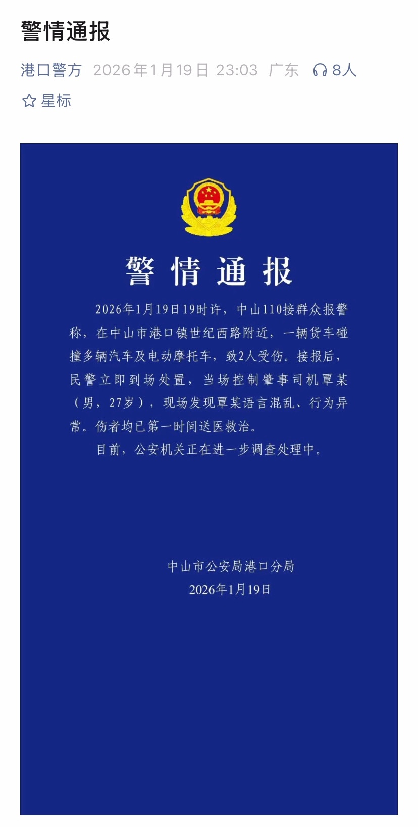 1月19日,中山市公安局港口分局发布警情通报:2026年1月19日19时许,中山110接大众报警称,在中山市港口镇世纪西路邻近,一辆卡车磕碰多辆轿车及电动摩托车,致2人受伤。接报后,民警当即参与处置,当场操控闯祸司机覃某(男,27岁),现场发现覃某言语紊乱、行为反常。伤者均已第一时间送医救治。现在,公安机关正在进一步查询处理中。